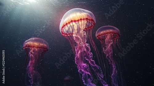 surreal, underwater, earth, glowing, jellyfish, drifting, softly, dark, ocean, emitting, radiant, light, shades, purple, pink, scene, calm, wonder, honed, magical, atmosphere, sea, fish, water, blue, animal, jelly, aquarium, marin, medusa, nature, life, swim, deep, aquatic, wildlife, tentacle, sting, transparent, semitransparent, black, floating