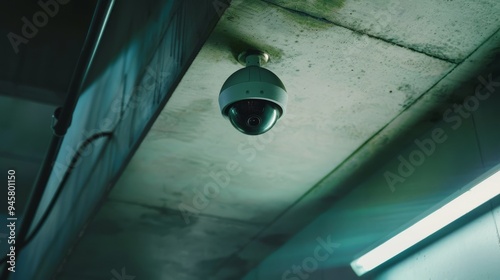 A surveillance camera peers down from a concrete ceiling in a stark, dimly lit environment, evoking themes of security and privacy.