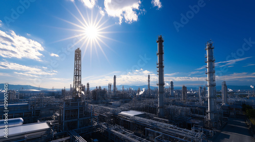 industrial, petrochemical, complex, blue skies, sunlight, shining, machinery, pipeline, chimney, production, manufacturing, processing, infrastructure, technology, engineering, construction, development, industrialization, facility, equipment, structure, industrial plant, power generation, environmental impact, industrial design, industrial zone, industrial estate, industrial park, industrial revolution
