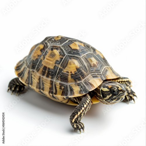 A sweet little turtle with a patterned shell, walking slowly, isolated on white background