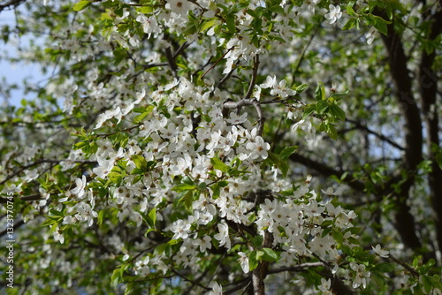 cherry blossom, blossom, flower, white, star-shaped, green leaf, tree branch, closeup, macro, soft focus, blurred background, spring, nature, beauty, delicate, serene, fresh, tranquil, renewal, warmth, light, vibrant, colourful, contrast, texture, composition, artistic, photo, floral, botanical, garden, park, landscape, springtime, blooming, blossoming, growth, life, hope, joy, happiness, peaceful, calming, inspiring, romantic, graceful, elegant