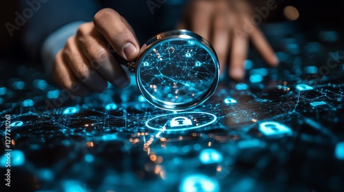 A system engineer inspecting padlock icons on a secure business network interface with a magnifying glass, emphasizing information security technology and network protection