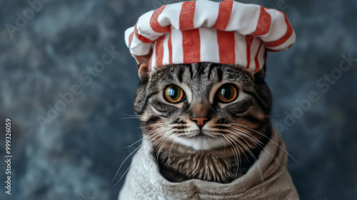 cat, tabby, chef, hat, striped, red, white, pet, animal, felino, cute, adorable, funny, portrait, closeup, looking, serious, expression, background, blue, wall, domestic, mammal, domestic cat, grey