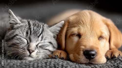puppy, kitten, cat, dog, sleeping, cute, adorable, pet, friends, animal, love, domestic, friendship, together, cosy, blanket, knitted, grey, fur, paw, peaceful, sweet, mammal, tabby, gold, canino, felino, childhood, family, rest, relaxation, comfort, indoor, portrait, closeup, bonding, warmth, innocence