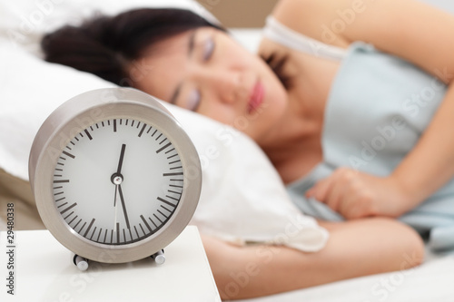 sleeping, clock, woman, resting, napping, bed, bedchamber, indoor, home, female, asian, chinese, table, malaysian, horizontal, time, modern, white, upper body, front view, one person, 30s