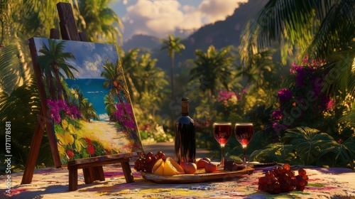 A table featuring elegant glasses of red and white wine, a wine bottle, and tropical fruits.