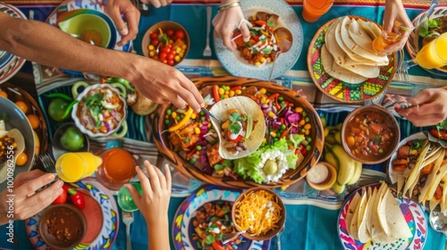 A table full of Mexican food with people eating it
