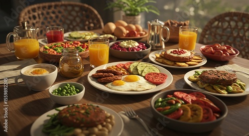 breakfast, table, food, egg, sausage, vegetable, juice, orange juice, pea, salad, tomatoes, courgette, bread, fruit, sirup, meal, dish, dining, interior, still life, healthy, nourishment, cookery, morning, delicious, fresh, plate, fork, glasses, bowl, wooden table, indoor, light, plant, tableware, epicure, cooked, presentation, arrangement, closeup, dining table, lunch, dinner