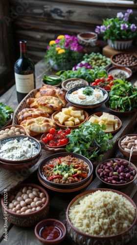 georgian, food, supra, feast, traditional, table, dish, wine, bread, cheese, vegetable, tomatoes, cilantro, bean, rice, bowl, plate, rustic, wooden, brown, green, red, white, culture, cookery, georgia, dining, meal, delicious, tasty, appetising, flavorful, savoury, homemade, fresh, organic, healthy, comfort, celebration, gathering