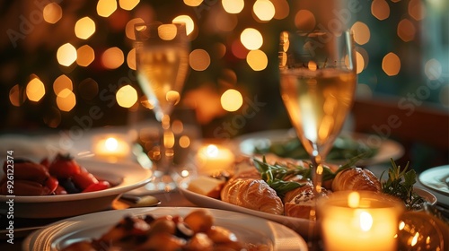 A table of food, delicious candlelight dinner, bokeh. Generative AI.