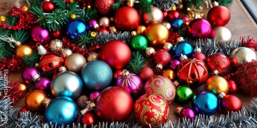 A table overflowing with colorful Christmas ornaments, baubles, and tinsel, blue, spheres