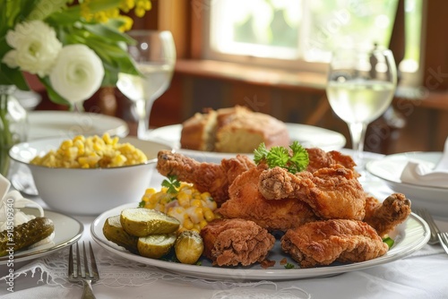 A table setting with a platter of fried chicken, cornbread, and pickles, representing a Southernstyle meal