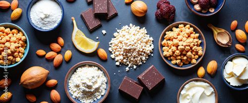 A table with a variety of food items including eggs, nuts, and cheese. The table is set with bowls and a spoon