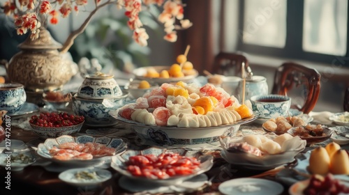 A table with a variety of traditional Asian desserts, including fruits, preserves, dumplings, and tea pastries. Ceramic dishes hold the food in an elegant display for a festive or formal gathering.