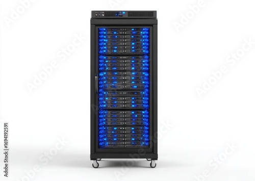 server, rack, black, blue, illuminated, technology, computer, datum, storage, hardware, equipment, digital, network, cyber, cabinet, frame, component, tech, panel, glasses, cooling, ventilation, system, modern, industrial, front, view, isolated, white, background, three-dimensional, rendering, graphic, image, powerful, efficient, high technology, computing, server, rack, light
