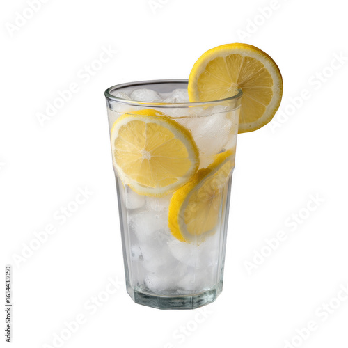A tall glass filled with ice cubes and fresh lemon slices, showcasing a refreshing beverage ideal for hot summer days.
