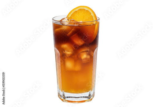 iced, hot drink, drink, beverage, cold, refreshing, glasses, ice, cube, orange, slice, garnish, summer, cafes, bar, cocktail, energy, caffeine, dark, liquid, condensation, isolated, white, background, cut-out, clipping path, refreshment, citrous, transparent