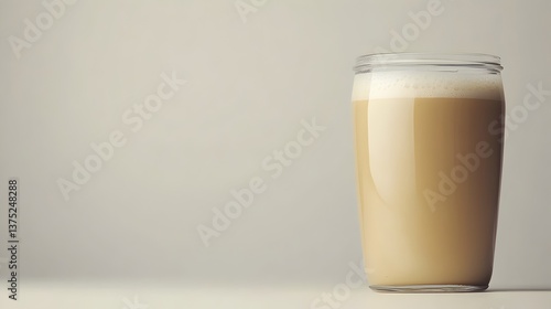 A tall glass of creamy latte sits on a plain white surface against a neutral background perfect for coffee shop menu designs.