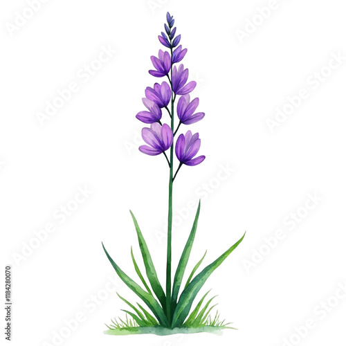 A tall, slender plant with purple flowers and green leaves