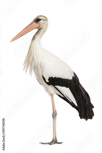 A tall stork with a long beak stands elegantly, showcasing its distinctive black and white plumage against a plain background.