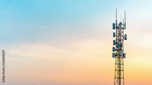 A tall telecommunications tower stands against a pastel sky, equipped with antennas, symbolizing connectivity and modern technology.