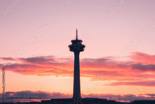 A tall tower is silhouetted against a pink and orange sky