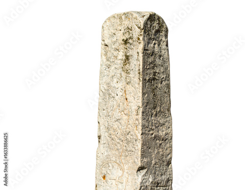 A tall, weathered ancient stone monolith, isolated against a transparent background, perfect for architectural or historical projects.