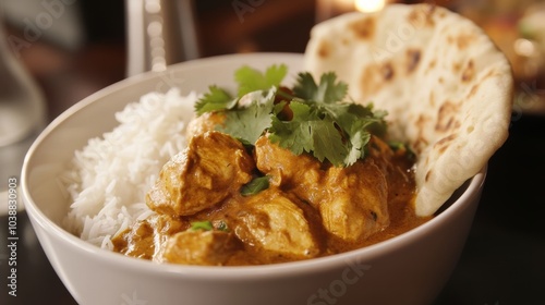 bowl, chicken, curry, served, fluffy, basmati, rice, bread, placed, off-center, warm, tungsten, light, comforting, experiencing, fresh, cilantro, leaf, garnish