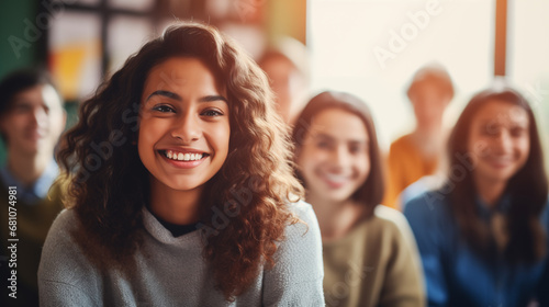A teacher with students of various ethnic backgrounds in a classroom, diverse ethnicities, blurred background, bokeh, with copy space