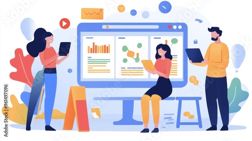 A team of professionals analyze data on a computer screen to develop customer retention and growth strategies. The image represents collaboration, data analysis, and strategic planning for business su