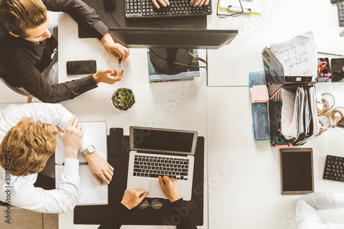 A team of young businessmen working and communicating together in an office. Corporate businessteam and manager in a meeting.
