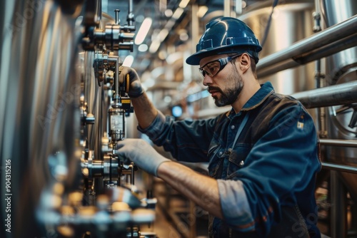 technician, brewery, facility, industrial, brewing, process, monitoring, quality, control, efficiency, modern, equipment, men at work, manufacturing, production, beer, beverage, industry, automation, technology, safety, helmet, glove, factory, machinery, maintenance, inspection, operation, assurance, engineer, professional, expert, craftsmanship, innovation