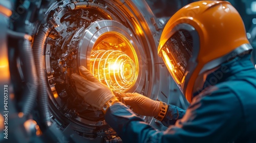 A technician in an orange helmet works on advanced technology, focusing on a glowing control panel in a futuristic environment.
