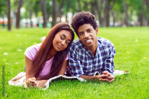 A teen black couple smiles at the camera while lying on a blanket in a grassy park. The girl is resting her head on guys shoulder. They are enjoying a sunny summer day together.