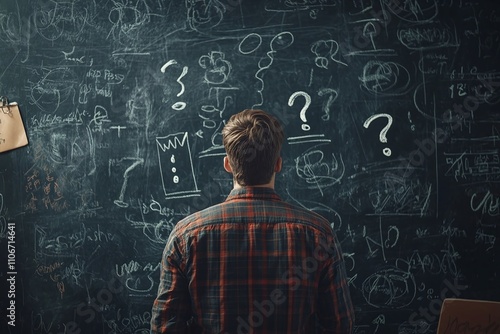 A teenage boy stands before a blackboard of doodles and question marks, his head a mess of thoughts, symbolizing ADHD, stress, anxiety, confusion, and mindfulness concepts.