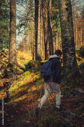 teenage, boy, walking, forest, autumn, nature, path, tree, leaf, colourful, gold, brown, orange, trail, peaceful, calm, wood, journey, adventure, discovery, freedom, wilderness, scenic, earth, root, trunk, hillside, exploration, environment, natural, vibrant, rustic, sunlight, landscape, serene, quiet, dreamy, inspiring, solitude, connection, casual attire, seasonal, earthy, charming, reflective, calmness, soft, atmosphere