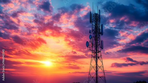 A telecommunications tower silhouetted against a vibrant sunset sky.