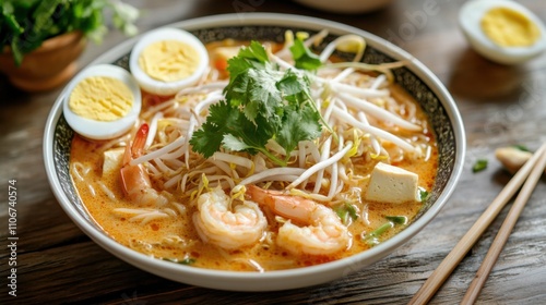 tempting, plate, malaysian, spicey, coconut, milk, soup, noodle, shrimp, tofu, bean, sprout, centered, soft, hawker, stall, lighting, creating, authentic, vibe, hardboiled, egg, half, fresh, cilantro, garnish