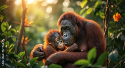 A tender adult orangutan embracing a juvenile in a lush forest with warm, golden sunlight filtering through the foliage.