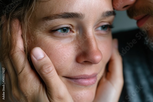 A tender close-up capture of a couple sharing an intimate moment, highlighting their affectionate gestures and the beauty of human connection and emotions in a soft-light setting.
