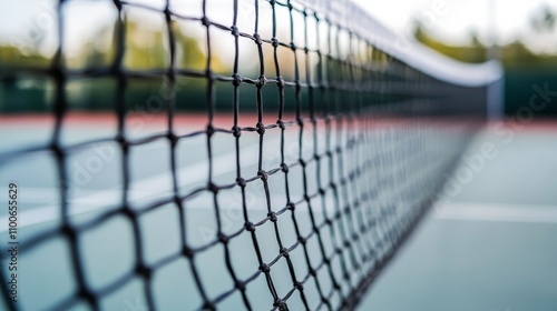 A tennis court net with a focus on the netting and posts, outdoor setting on a sunny day, Minimalist style