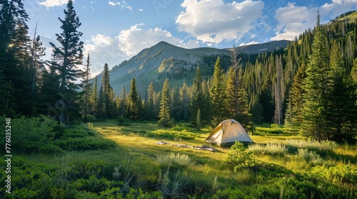 A tent pitched in a serene meadow AI generated illustration