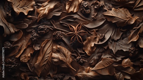 leaf, spice, texture, arrangement, organic, design, nature, brown, decoration, art, floral, background, pattern, foliage, herbal, aesthetic, surface, detail, natural, warmth, rustic, culinary, aroma, earth, botanical, seasonal, earthy, ambience, craftsmanship, elegance, harmony, creativity, visual, composition, inspiration, calmness, richness, contrast, simplicity, artistry, depth