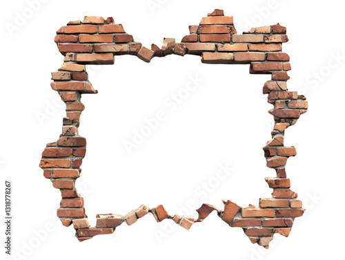 A textured, broken brick wall with a unique frame shape, creating an artistic display of decay and structural design.