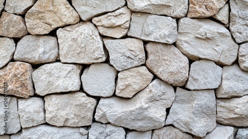 A textured stone wall made of various shapes and sizes of light-colored stones.
