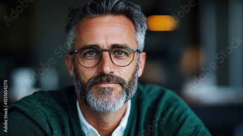 A thoughtful and sophisticated man with glasses and a stylish beard is gazing directly at the camera, creating an engaging and insightful atmosphere in the image.