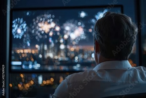 A thoughtful individual watching a mesmerizing fireworks display from a city apartment, capturing the essence of contemplation and joy amidst a vibrant urban backdrop.