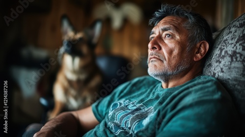 A thoughtful man sitting in a cozy indoor environment, lost in reflection while his loyal dog sits beside him, illustrating companionship and quiet moments.