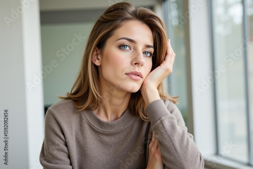 woman, young, caucasian, thoughtful, contemplation, serenity, window, casual attire, sweater, indoor, bright, minimalist, portrait, elegant, expression, beauty, mood, emotion, pensive, relaxed, natural, light, sharpened, lifestyle, elegance, atmosphere, peaceful, style, head shot, serene, modern, interior, genuine, looking, calm, breathe, solitude, reflective, trendy, soft, graceful, personal