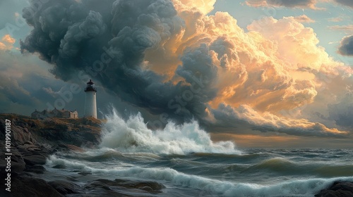 A thundercloud approaching a lighthouse on the coast, with waves crashing against the rocky shore.